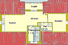Wohnzimmer mit Küche, 1 Schlafzimmer, WC und Dusche, Loggia, Parkplatz, Abstellraum für Fahrräder und Gepäck.