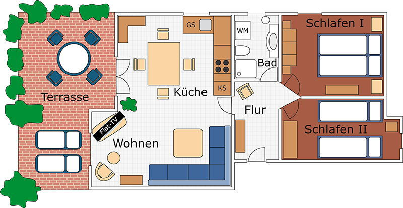 Es erwarten Sie bezogene Betten sowie eine Erstausstattung Handtücher/ Geschirrtücher.
